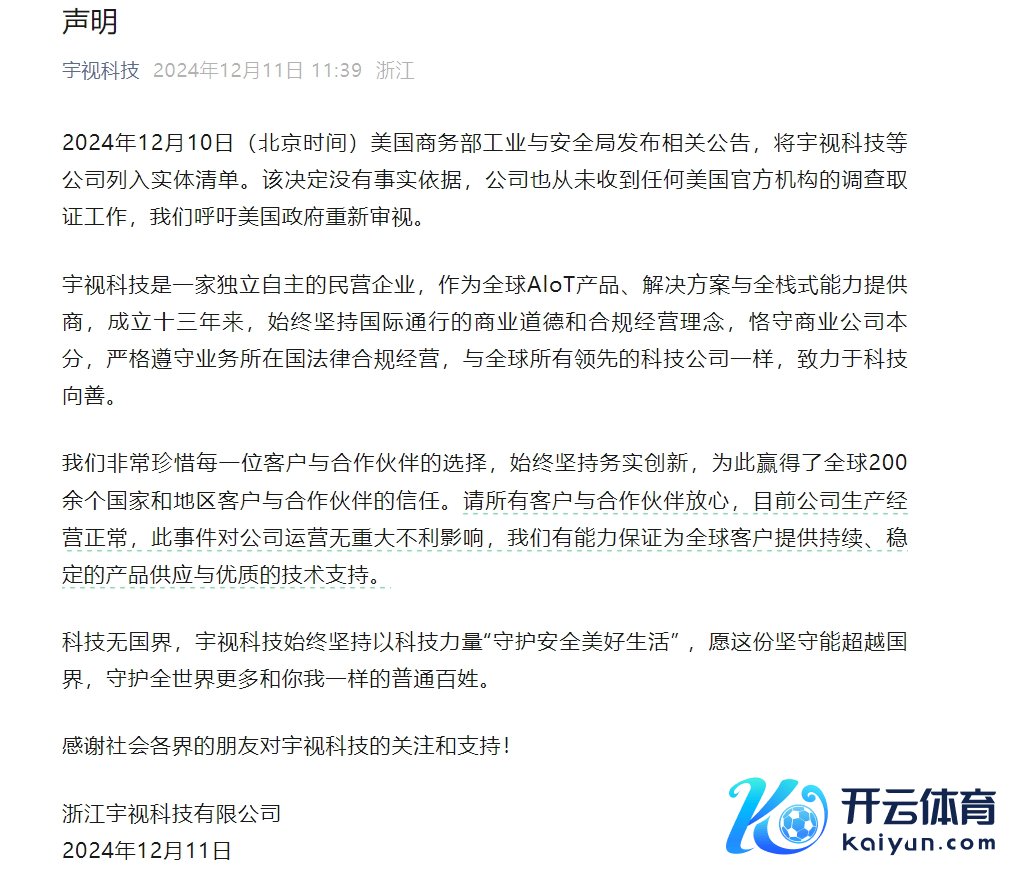 宇视科技:公司被列入“实体清单”莫得事实依据 目下分娩谈判平时开云kaiyun宇视科技:公司被列入“实体清单”莫得事实依据 目下分娩谈判平时